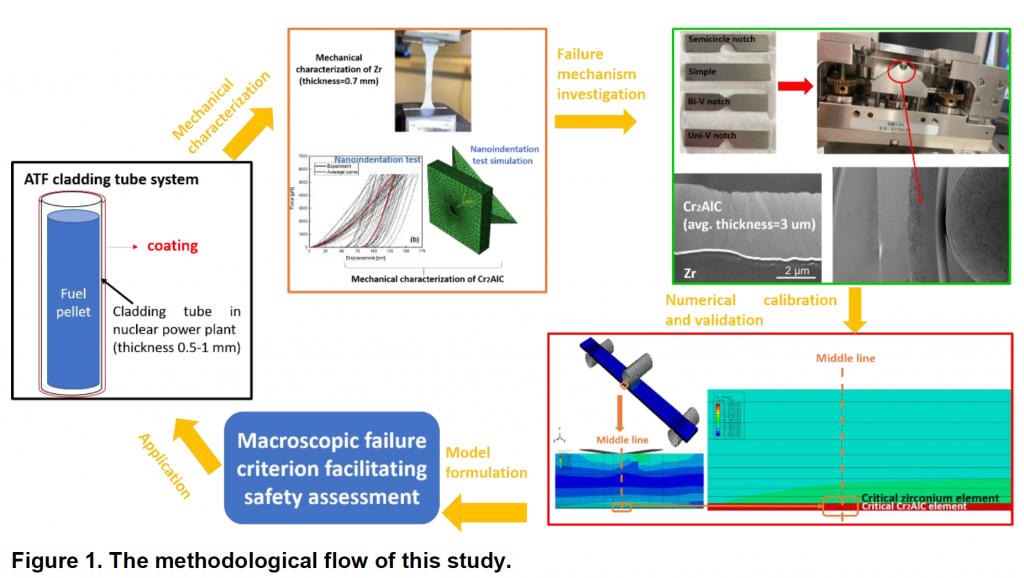 Considering the current structure of the cladding tube and its development requirement, a novel cladding tube system is proposed by depositing a Cr2AlC thin film onto a zirconium sheet. By carrying out a hybrid experimental and numerical investigation on the Cr2AlC-coated zirconium samples, the integrity of Cr2AlC-coated zirconium samples is assessed. The proposed methodology and simulation model can also be transferred to other similar cladding tube structures. Furthermore, it can be concluded that: