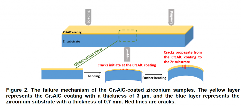 • The failure mechanism of the Cr2AlC-coated zirconium samples involves cracks initiate within the Cr2AlC coatings, propagating from the coating to the zirconium substrate upon further mechanical loading.