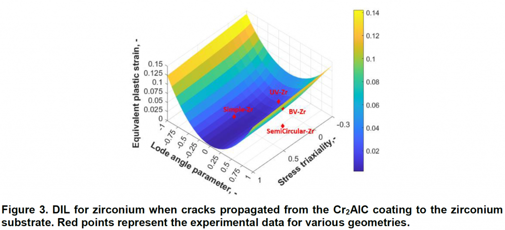 With the collected PEEQ, 𝜂𝑎𝑣𝑔, 𝜃̅𝑎𝑣𝑔 of the zirconium element of different samples at the crack propagation moments, the damage initiation locus (DIL) for zirconium when cracks propagated from the coating to the substrate can be constructed in MATLAB, as shown in Figure 3. The experimental points representing samples with different geometries are also plotted inside for comparison. Except for the experimental point of the semi-circular sample, other experimental points align well with the DIL.