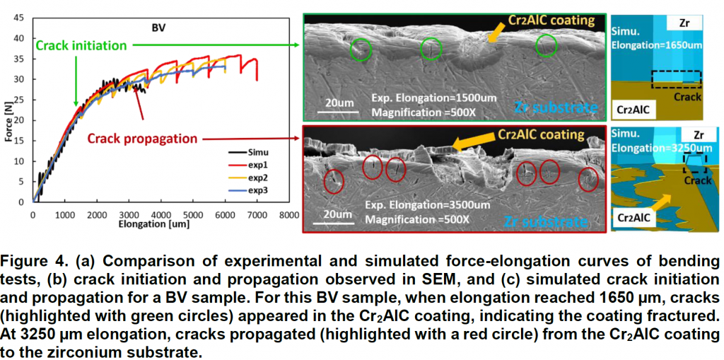 With the MPS processed with the Weibull distribution and the calibrated MBW model parameters, crack initiation and propagation could be simulated and predicted, and compared with the experimental results. Figure 4 uses the BV sample as an example, comparing the experimental and simulated force-elongation curves, the observed crack initiation and propagation in SEM, and the simulated crack initiation and propagation. The blue layer represents the zirconium substrate, and the yellow layer represents the Cr2AlC coating. When the simulated elongation was 1600 μm, the Cr2AlC coating showed a complete structure; however, when the simulated elongation reached 1625 μm, the Cr2AlC coating elements were deleted, indicating the coating fracture. With further loading, when the simulated elongation reached 3250 μm, most of the coating elements were deleted, and the crack propagated from the Cr2AlC coating to the zirconium substrate, indicated by the zirconium element deletion. Notably, the model was tilted along the width direction when capturing the images so the element deletion could be better observed and presented. Compared with the experimental observation, the simulated elongation at Cr2AlC coating fractured and crack propagation fell into the experimental ranges. The crack initiation and propagation were also simulated and predicted with satisfying accuracy for coated samples with other geometries, indicating a successful validation of the applied macroscopic criterion.