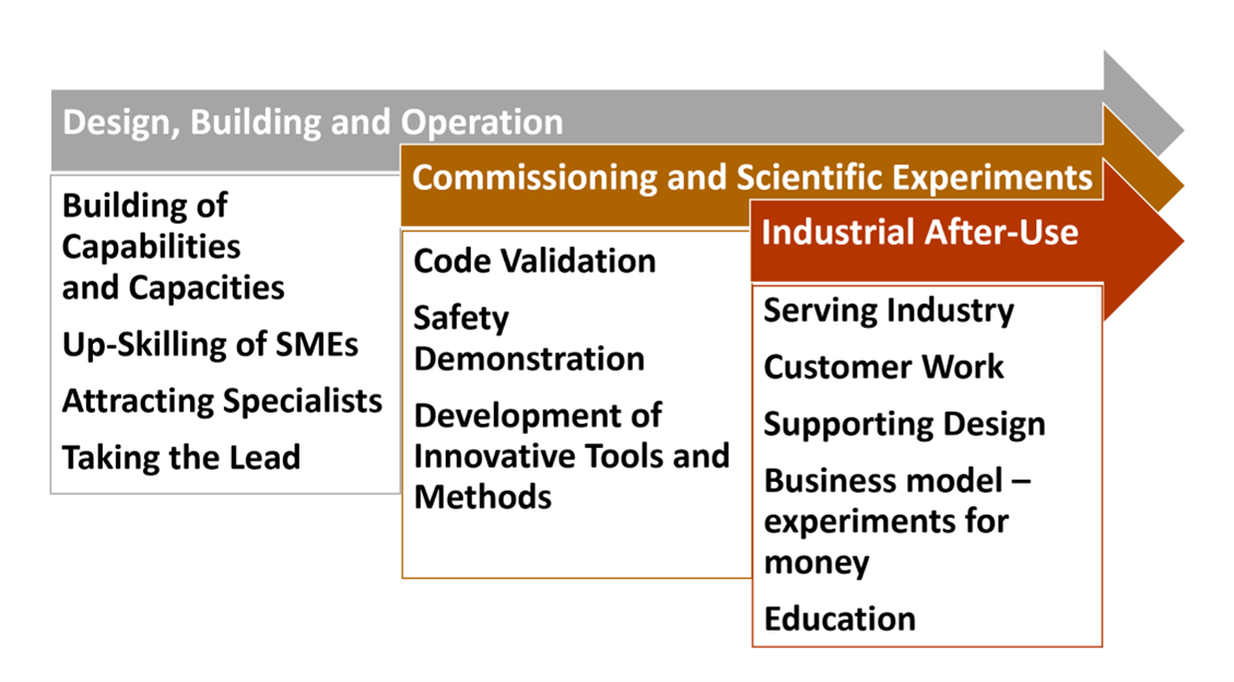 Delivering the zero-power facility will create a focal point for a longer-term game changer technology which will support the formation of the teams and educating the specialist for the next step in the process. The facility opens the opportunity for spin-offs of the technology already at a very early stage through paid experiments before achieving the industrial scale demonstrator, see Figure 4. The zero power experiments help accelerating the next steps and avoid potential mistakes (which can be really costly for a large-scale demonstrators) due to the availability of experience and expertise with a real project. The opportunity of quick studies in a safe setting to test technologies and to optimize new approaches will create very valuable experience and data. A role which has been described through the development of the German HTR program where the zero-power experiment KATHER was set up very late for the design phase of the industrial demonstrator [11].