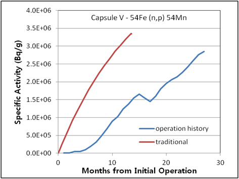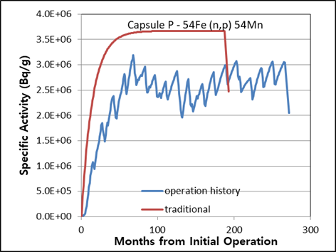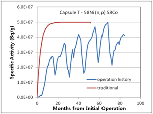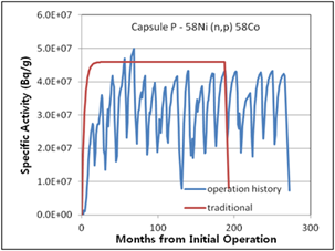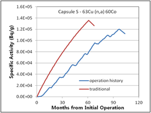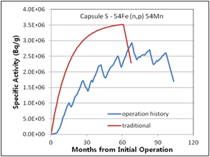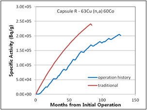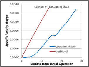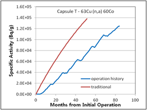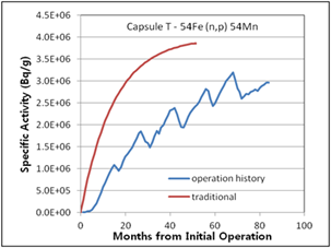 Figure 7. Specific activities considering operation history compared with traditional method for 2nd surveillance capsule T