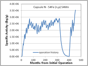 The 6th surveillance capsule, N, which has a complicated irradiation history, was excluded from this comparison. Only the activity calculation results obtained using the proposed method are shown in (Figure 11) because it is unreasonable to assume a representative production rate or flux in case of a complicated irradiation history. However, it is observed in (Table 5) that the calculated activity results considering detailed plant-specific history and the measured activity results for capsule N show good agreement.