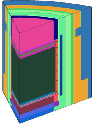 (Figure 2) shows the three dimensional neutron transport calculation model used in this study. (Figure 3) shows the plan view of reactor geometry at the core mid-plane. A single octant depicts the arrangement of thermal shield and surveillance capsule attachments. In addition to the core, reactor internals, pressure vessel and primary biological shield, the models developed for these octant geometries also include explicit representations of the surveillance capsules, the pressure vessel cladding, the pressure vessel reflective insulation, and the reactor cavity liner plate.