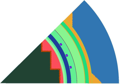 In developing the R-θ-Z analytical models of the reactor geometry shown in (Figure 2), nominal design dimensions were employed for the different structural components. The stainless-steel former plates located between the core baffle and core barrel regions were also explicitly included in the model. The water temperatures and coolant density in the reactor core and downcomer regions of the reactor were considered to be representative of full power operating conditions (1723.5 MWth).The reactor core was considered as a homogeneous mixture of fuel, cladding, water and miscellaneous core structures such as fuel assembly grids, and guide tubes.