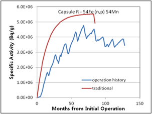 Figure 9. Specific activities considering operation history compared with traditional method for 4th surveillance capsule R