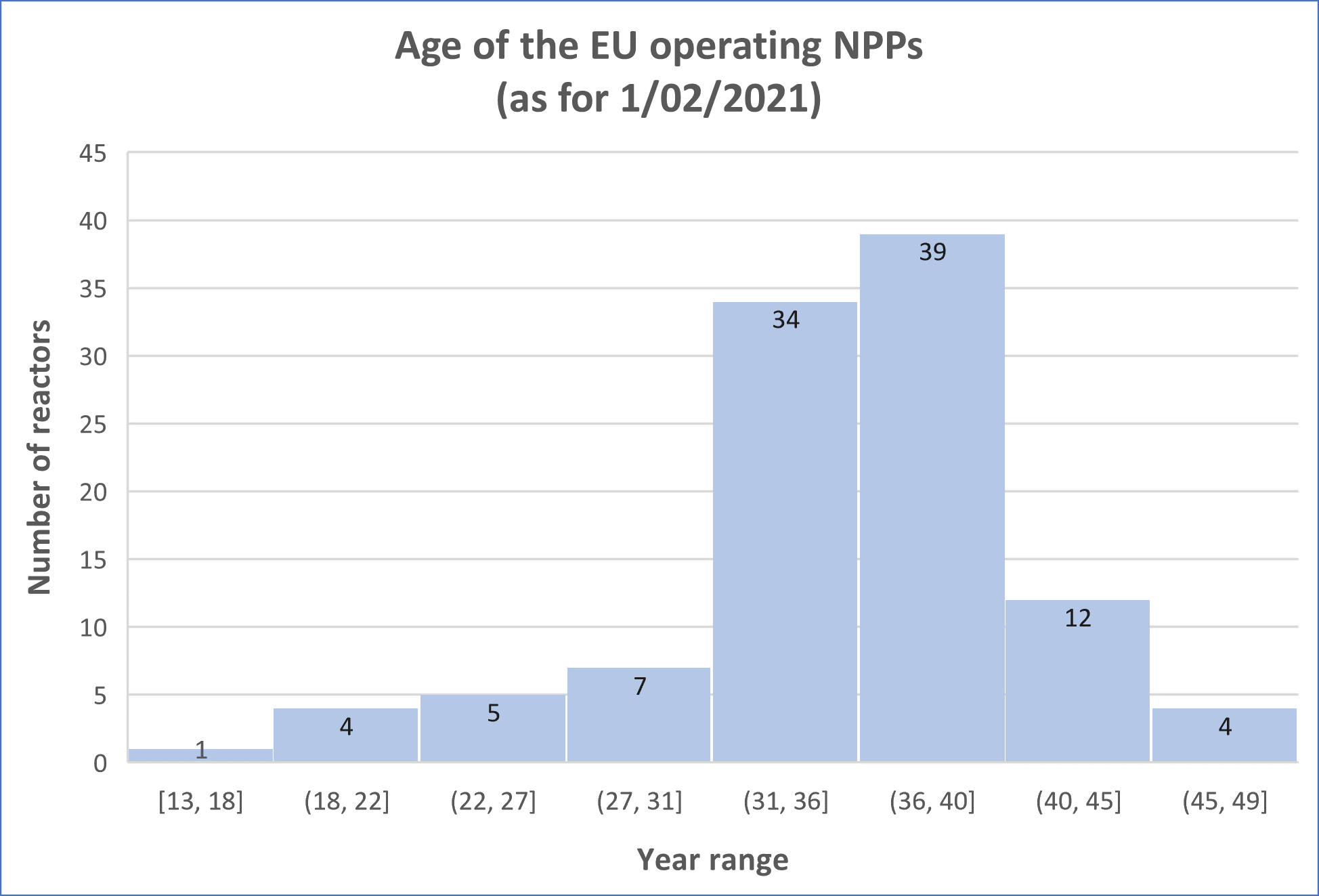There are 106 nuclear power reactors in operation in the European Union (EU) in 13 of the 27 EU countries. The age distribution of current nuclear power plants is shown in Figure 1. A major part of the EU reactors are between 31 to 40 years old. Hence, from both the safety and security of supply viewpoints, ageing of these power plants is of increasing concern to European policy makers, citizens and utilities.