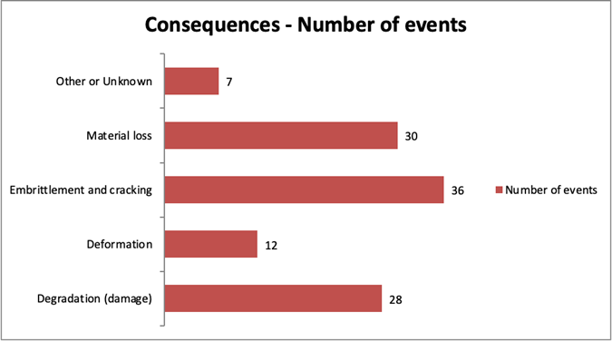 Figure 10 shows the distribution of events among different consequences. 36 events were related to embrittlement and cracking and 30 events to material loss (mainly due to corrosion).