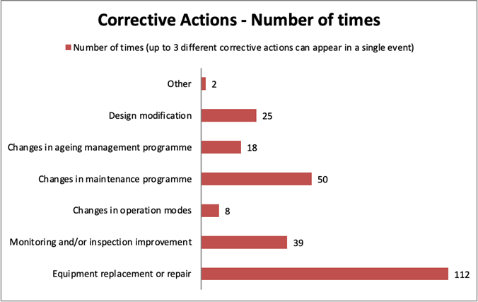 Figure 11 illustrates the corrective actions. A maximum of three corrective actions were allocated to a single event. As expected, the main corrective action was the replacement or repair of equipment. Changes in maintenance programme was the second most usual corrective action followed, in this order, by monitoring or inspection improvement, design modification and changes in ageing management programme.