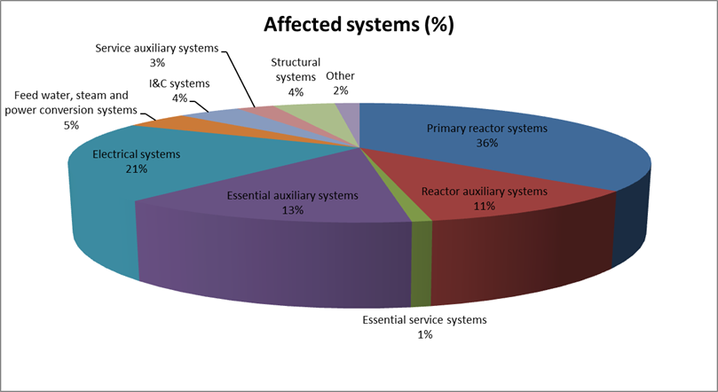 The distribution of events per system affected is presented in Figure 3. The largest percentage (36%) corresponds to the primary reactor systems, followed by electrical systems (21%) and essential auxiliary systems (13%).