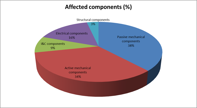 The distribution of events per component affected is given in Figure 4. Passive and active mechanical components are the most affected components (38% and 34%, respectively), followed by electrical (16%), I&C (9%) and structural components (3%).