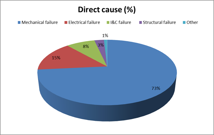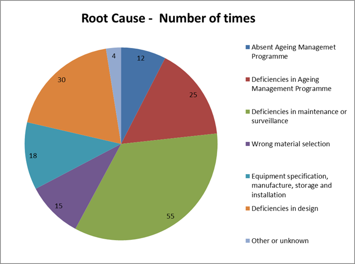 Figure 5 indicates that the main direct cause was mechanical failure. The distribution of root causes is given in Figure 6. A maximum of three different root causes was attributed to each event. Deficiencies in maintenance or surveillance is the most important root cause, followed by deficiencies in design and in ageing management programmes. To this respect, we infer that the establishment of an effective ageing management programme, as early as possible in the lifetime of the plant, will significantly contribute to preventing events and the resulting consequences.