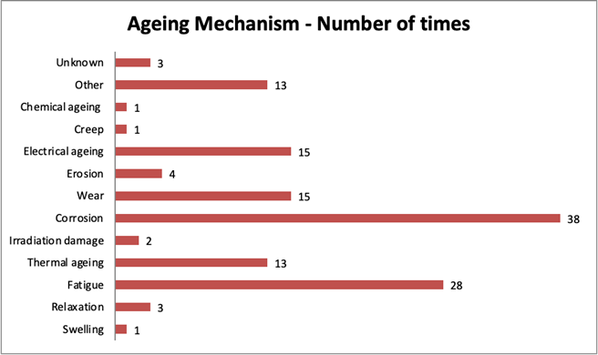 The category „ageing mechanism“ was split in 13 families, as indicated in Table 2, making it possible to allocate several (maximum three) ageing mechanisms to a single event. Figure 7 shows that corrosion (38 times) is the main cause of failure, followed by fatigue (28 times). Other important contributions are coming from thermal ageing, wear and electrical ageing.