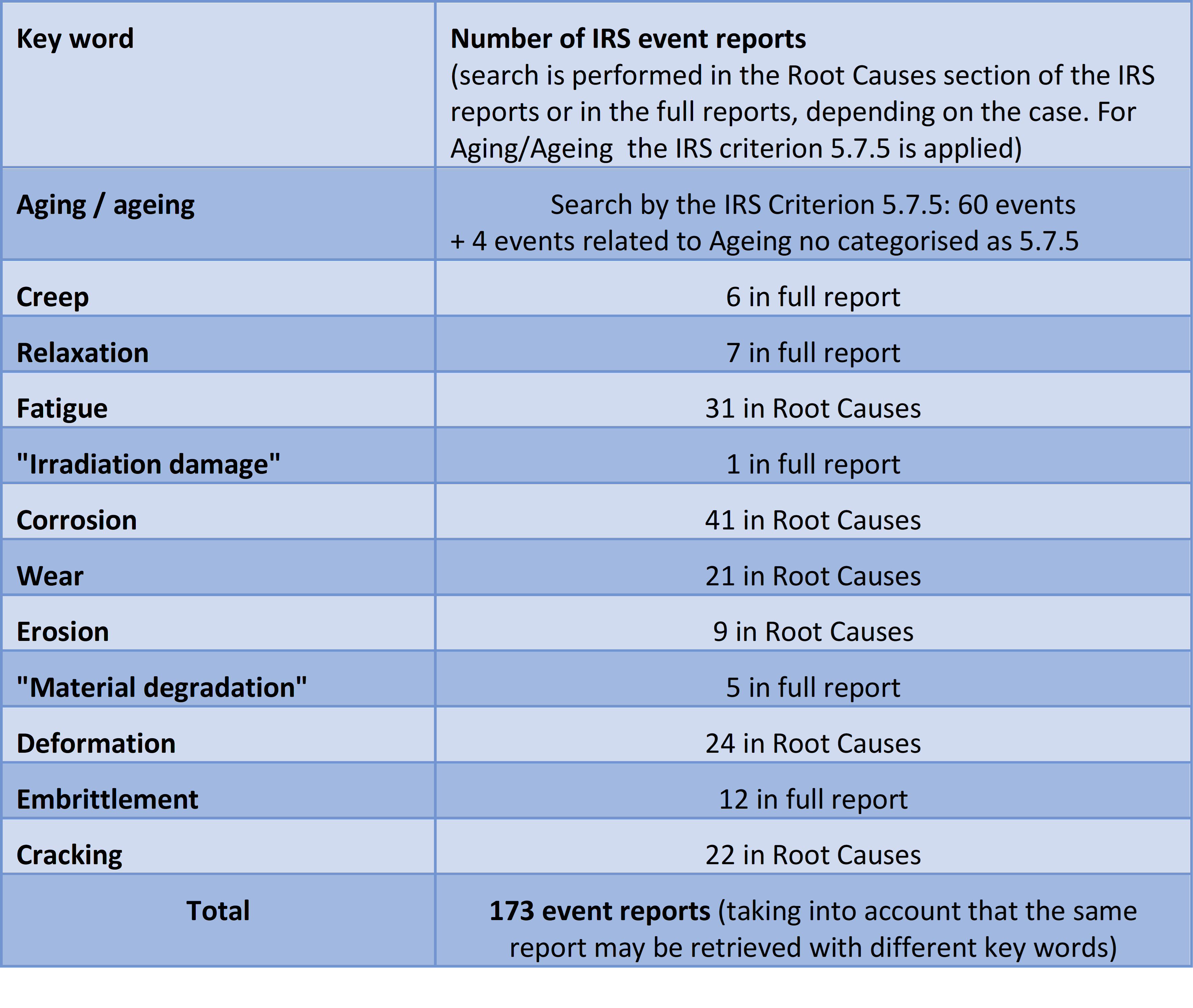 The query result in the IRS database for the period 01/01/2008 – 30/06/2018 was a list of 173 ageing event reports (step 1), which were reviewed to confirm their relevance. The querying results are summarized in Table 1, where the number of event reports is given together with the guide words used for the screening. IRS allows querying ageing events using the IRS code 5.7.5. But it was noted that some ageing events were not classified under this specific code. For that reason querying was also carried out by searching ageing events using different degradation mechanisms and their consequences.