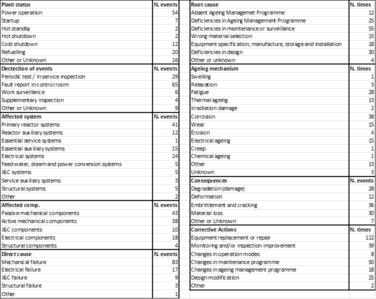 This section presents the result of the screening and classification process described above. The number of events for each family in a given category (plant status, detection, affected system, affected component, direct cause, root cause, ageing mechanism, consequences, corrective actions) is shown in Table 2.