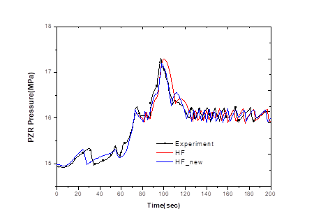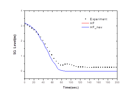The SPACE predictions also show similar results to the experimental results. Initially, the main feedwater to the steam generator is interrupted, causing the pressurizer pressure to rise just like the experiment. The pressure that was decreasing due to the operation of the pressurizer spray system gradually increases again after the spray system stops. The increased pressure is reduced again in 55 seconds by the operation of the spray system. The MSCV of the steam generator closes at 67.3 seconds, resulting in a rapid increase in pressure as shown in the experimental results. The pressure then reaches the open setting of the pressurizer PORV, which opened at 73.8 seconds, but continue to rise, somewhat different from the experimental value trend. The rising pressure decreases at 90 seconds, but without the complement of the steam generator’s main feedwater, the pressure rises again and reaches a maximum pressure slightly higher than the experimental results at 103 seconds. Subsequently, the pressure s reduced due to the operation of the PORV, SRV, and pressurizer spray systems of the steam generator, and after 120 seconds, the rise and fall are repeated near 15.5MPa to 16MPa.