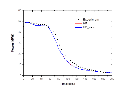 Fig. 5. shows the changes core power. According to the experimental results, if the main feedwater of the steam generator is closed, the primary system heat removal is lost and the temperature and pressure of the primary coolant are increased. As the temperature of the coolant cooling the core increases, the core power decreases gradually due to the feedback effect of the moderator. At 67.3 seconds, when the MSCV of the steam generator is closed, the core power is also rapidly reduced.