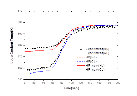 Fig. 7. shows the temperature of the coolant due to transient conditions. Experimental results show that the temperature of the coolant is slowly increasing as the main feedwater is closed. The increasing temperature of the coolant rises rapidly after 60 seconds due to the continued loss of the heat sink, and then the MSCV of the steam generator closes at 67.3 seconds, which increases the temperature even more rapidly. After 100 seconds, when the pressurizer pressure is at its peak, the pressure increase is slowed due to the operation of SRV and PORV of the pressurizer, and thus the temperature increase is slowed. As the pressure of the system is maintained constant, the temperature of the coolant is maintained constant.